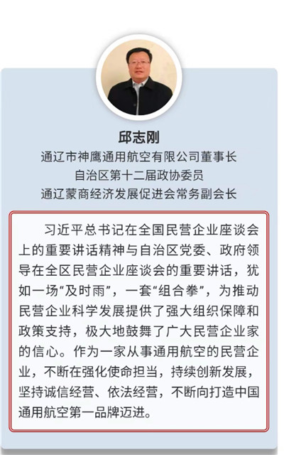 通遼市神鷹通用航空有限公司董事長、自治區(qū)政協(xié)第十二屆委員會委員邱志剛,作為自治區(qū)企業(yè)家代表應邀參加了此次座談會。會后,按照自治區(qū)統(tǒng)戰(zhàn)部的統(tǒng)一部署,提交了參加座談會的收獲與感受,表示:一定要認真貫徹布小林主席講話精神,不斷在強化使命擔當,持續(xù)創(chuàng)新發(fā)展,堅持誠信經營、依法經營上下功夫,不斷向中國通用航空第一品牌邁進。