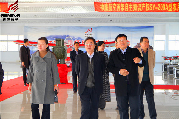 高海濤巡視員及工作組參觀了通遼市神鷹飛機制造在限公司。通遼市神鷹通用航空有限公司董事長邱志剛向檢查組詳細介紹了“SY-200”農(nóng)用飛機和植保無人機研發(fā)制造情況,匯報了公司當前和今后的發(fā)展目標和方向。期間,高海濤巡視員還親切地詢問了公司在發(fā)展建設(shè)中遇到的困難。
